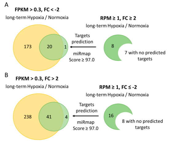 Analysis of putative microRNA-gene interactions using a target prediction database. The putative targets of differentially expressed microRNAs (excluding microRNAs overlapping in short-term hypoxia) in the 786-O cells undergoing long-term hypoxia were analyzed using the miRmap database. The criterion was defined as a miRmap score ≥97.0. Venn diagram analysis showed that (A) 20 putative targets of 8 upregulated microRNAs were also observed in the gene list of 193 downregulated mRNAs; and (B) 41 putative targets of 16 downregulated microRNAs were also observed in the gene list of 279 upregulated mRNAs.