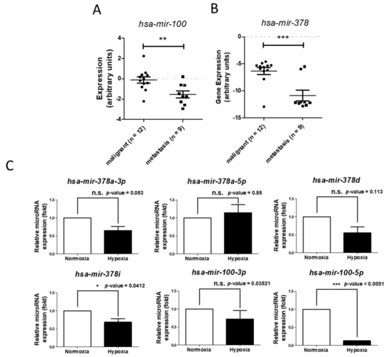The expression levels of differentially expressed microRNAs, hsa-mir-100 (A) and hsa-mir-378 (B); identified in 786-O cells with long-term hypoxia compared to normoxia were analyzed on a microarray (GSE37989), which provides 21 clinical ccRCC samples (malignant ccRCC, n = 12; bone metastasis ccRCC, n = 9). The expression values were obtained using the GEO2R web tool and re-plotted; (C) qRT-PCR analysis of microRNAs expressions (hsa-mir-378a-3p, hsa-mir-378a-5p, hsa-mir-378d, hsa-mir-378i, hsa-mir-100-3p and hsa-mir-100-5p) in 786-O treated with normoxia and long-term hypoxia. U6 was used as internal control. (p-value of GSE37989 microarray and qRT-PCR were calculated by unpaired t-test and paired t-test respectively, * p-value < 0.05, ** p-value < 0.01, *** p-value < 0.001 and n.s. = no significance).