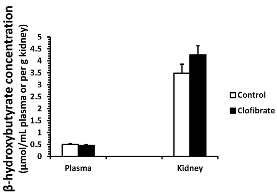 No differences were detected in β-hydroxybutyrate concentration measured in plasma and kidney tissues between control and clofibrate-treated pigs (p > 0.05). The concentration of β-hydroxybutyrate was on average 8-fold higher in kidney tissue compared with plasma (Figure 1).