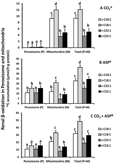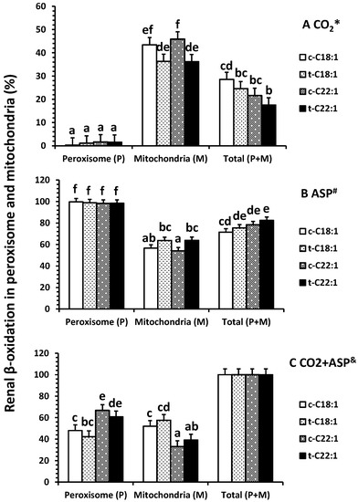 Percentage distribution of renal β-oxidation (% of 14C accumulation in CO2 * (A), ASP # (B), and CO2 + ASP & (C)) in peroxisomes and mitochondria of neonatal pigs. Values are least square means ± SEM (n = 5). Abbreviations: ASP: acid soluble product; c-C18:1: control with oleate; t-C18:1: treatment with oleate; c-C22:1: control with erucate; t-C22:1: treatment with erucate. * Clofibrate effect (p < 0.040) and fatty acid effect (p = 0.39); # Clofibrate effect (p < 0.0001) and fatty acid effect (p = 0.39); & Clofibrate effect (p = 1.0) and fatty acid effect (p = 1.0). Column with different letters differ (p < 0.05).
