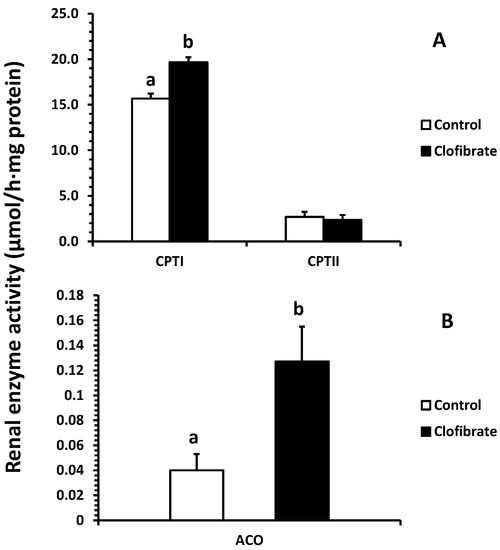 Effects of oral clofibrate on renal enzyme activity in neonatal pigs. Values are least square means ± SEM (n = 5). CPT I and CPT II, carnitine palmitoyltransferase I and II (A), and ACO, acyl-CoA oxidase (B). Columns with different letters are different (p < 0.05).