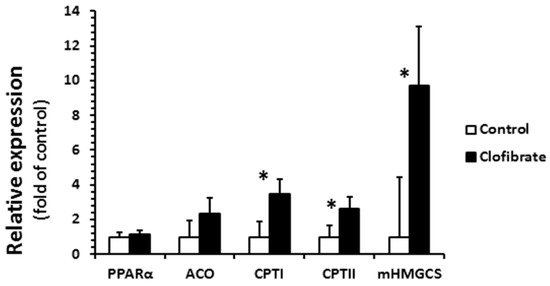 Renal mRNA abundance in pigs with and without oral clofibrate. Values are least square means ± SEM (n = 5). PPARα: peroxisome proliferator-activated receptor α; ACO: acyl-CoA oxidase; CPT I and CPT II: carnitine palmitoyltransferase I and II; mHMGCS: mitochondrial 3-hydroxy-3-methylglutaryl-coenzyme A synthase. * Significant difference between control and treatment groups (p < 0.05).