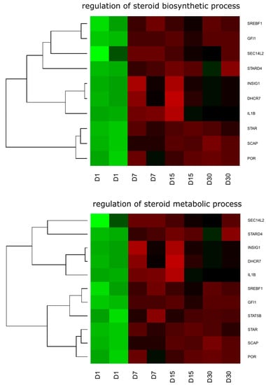 DAVID (Database for Annotation, Visualization and Integrated Discovery) software (Leidos Biomedical Research, Inc., National Cancer Institute, Frederick, MD, USA) was used for extraction of the genes belonging to the analyzed GO BP terms. Up and down regulated gene sets were subjected separately to a DAVID search, and only gene sets where adjusted p values were lower than 0.05 were selected. The DAVID software analysis showed that differently expressed genes belong to 582 gene ontology groups and 45 KEGG pathways. In this paper, we focused on the “regulation of steroid biosynthetic process” (GO:0050810) and “regulation of steroid metabolic process” (GO:0019218) GO BP terms. These sets of genes were subjected to a hierarchical clusterization procedure and presented as heat maps (Figure 1). The gene symbols, fold changes in expression, Entrez gene identifications (IDs), and corrected p values of these genes are shown in Table 1.