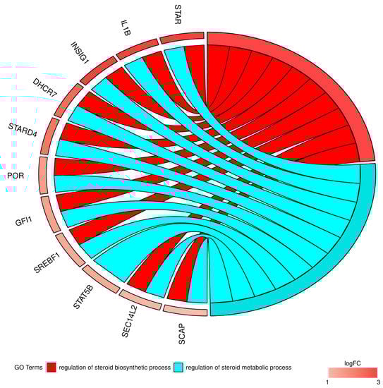 The representation of the mutual relationship between the “regulation of steroid biosynthetic process” and “regulation of steroid metabolic process” GO BP terms. The ribbons indicate which gene belongs to which categories. The genes were sorted by logFC from most to least changed gene, with the most changed gene marked with the most intense color on the side and presented topmost, and the least changed gene marked with the least intense color on the side and presented on the bottom.