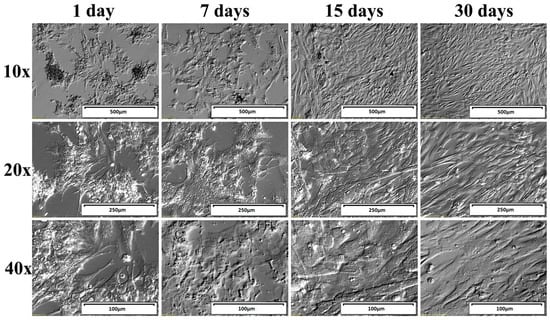 Collected cells were washed twice by centrifugation at 200× g for 10 min at room temperature with culture medium. Medium consisted of Dulbecco’s Modified Eagle’s Medium (DMEM/F12, Sigma-Aldrich, St. Louis, MO, USA), 2% fetal bovine serum FBS (FBS; Sigma-Aldrich Co., St. Louis, MO, USA), 200 mM l-glutamine (Invitrogen, Carlsbad, CA, USA), 10 mg/mL gentamicin (Invitrogen, USA), 10,000 units/mL penicillin, and 10,000 μg/mL streptomycin (Invitrogen, USA). Cells were cultivated at 37 °C under aerobic conditions (5% CO2). Once adherent cells were more than 90% confluent, they were detached with 0.05% trypsin-EDTA (Invitrogen, USA) for 1–2 min and counted using a counting chamber “neubauer improved” (ISO LAB Laborgerate GmbH, Wertheim, Germany, DIN EN ISO CERTIFIED 9001). GCs were cultivated for 30 days. Medium was changed twice a week. Finally, total RNA was isolated from GCs after 24 h, 168 h, 15 days, and 30 days. The changes in cell morphology were presented in Figure 5.