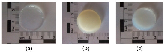 GelMA scaffolds after photopolymerization (a) 15% GelMA; (b) GelMA-Nanoliposomes 15%:1.5% (w/w); (c) GelMA-Emulsion 15%:1.5% (w/w).