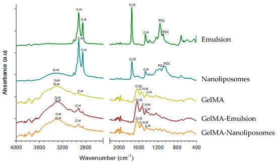 Material excited by infrared sources can be characterized by the spectra of molecular absorption and transmission peaks obtained from vibration frequencies between the bounds of atoms. Fourier-transform infrared spectroscopy (FTIR) is used essentially to characterize the presence of specific chemical groups in the hydrogels and to study the interaction between the blended polymers and the effect of the added nanoliposomes or nanodroplets in the polymers. The results show the spectrum of nanoliposomes, emulsion, pure GelMA hydrogel, and GelMA functionalized with nanoliposomes or nanoemulsion (Figure 2).
