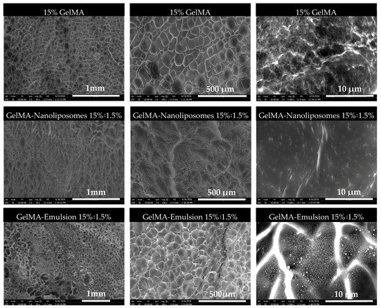 Scanning electron microscopy (SEM) images of 3D hydrogels (GelMA, GelMA-Nanoliposomes, and GelMA-Emulsion).