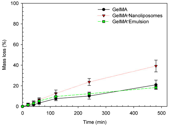 The degradation profiles of GelMA, GelMA-Emulsion, and GelMA-Nanoliposomes (Figure 4) showed that at a concentration of 2 µg/mL after 2 h of incubation the degradation rate was the same in the three systems, but after 4 h of incubation, type II collagenase had a tendency to degrade the GelMA-Nanoliposomes most rapidly. This tendency was confirmed after 8 h of incubation, and the rate of mass loss was approximately double (39.2% in GelMA-Nanoliposomes hydrogels against 21.0% and 18.3% in pure GelMA and GelMA-Emulsion hydrogels, respectively). This increase can be due to a physical phenomenon, as nanoliposomes incorporation increases pores size and enhances their distribution [29], which releases a way of privileged access to the collagenase, multiplying by twice the area of access sequences Arg-Gly-Asp (RGD), which are considered matrix metalloproteinase 2 (MMP-2) binding sites. These enzymes can degrade and remodel the extracellular matrix for cell spreading and migration.