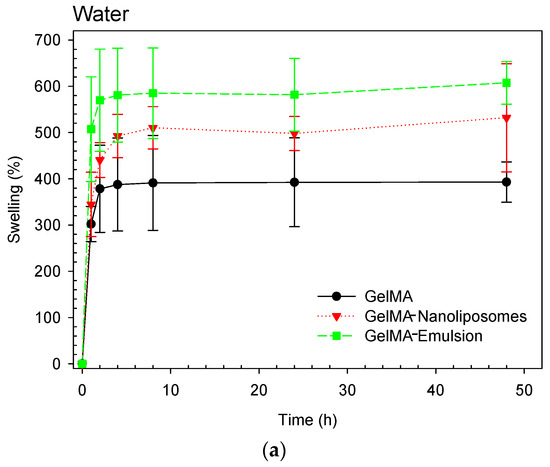 Degree of swelling of based hydrogels (GelMA (●), GelMA-Nanoliposomes (▼), and GelMA-Emulsion (■)) in two different solvents (a: deionized water and b: PBS solution), at 37 °C. Error bars represent standard deviation.