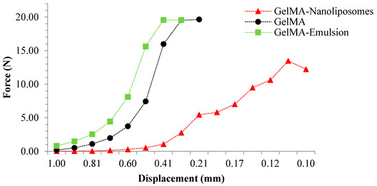 Typical force–displacement curves of GelMA hydrogels: pure GelMA (●) and Functionalized GelMA (▲: GelMA-Nanoliposomes and ■: GelMA-Emulsion).