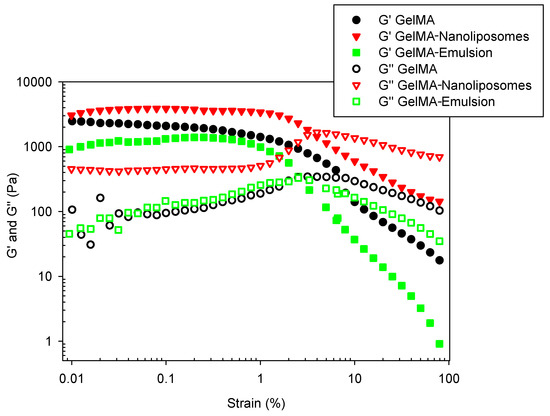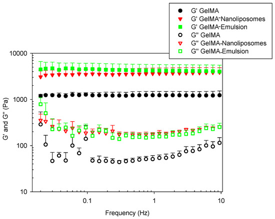 The incorporation of nanoliposomes and nanodroplets results in a significant increase of both G′ and G″. Considering that GelMA provides a big part of the hydrogel mechanical stability, the incorporation of nanoliposomes in the network walls and the adsorption of droplets on GelMA scaffold improve the elastic component of the resulting hydrogels.