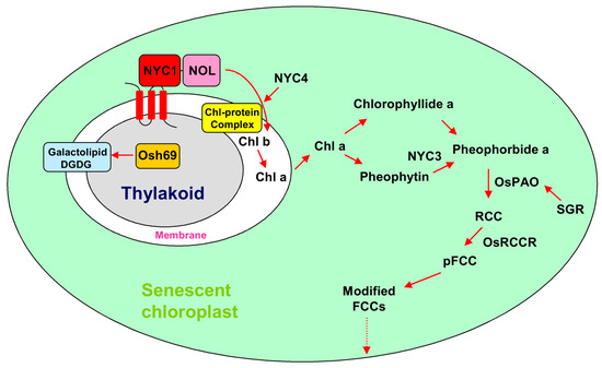 During leaf senescence, chloroplasts are the first organelles to be dismantled, which can induce the production of reactive oxygen species (ROS) such as hydrogen peroxide (H2O2), superoxide anion radicals (O2−), hydroxyl radicals (OH·), and singlet oxygen (1O2). As signaling triggers, ROS influence the expression of nuclear genes, thereby causing oxidative stress and damage to the cell [12,13,14,15]. The chlorophyll (Chl) degradation pathways involved in leaf senescence have been well established in recent years [16]. Based on the current literature, several SAGs are reported to relate to chlorophyll degradation in rice by using mutations that exhibit a stay-green phenotype in the process of leaf senescence (Table 1). During the degradation of chlorophyll, the first step is the conversion from Chl b to Chl a. NON-YELLOW COLORING 1 (NYC1), a chlorophyll b reductase for catalyzing the degradation chlorophyll b, encodes a chloroplast-localized short-chain dehydrogenase/reductase (SDR) and plays an important role in the degradation of the light-harvesting complex II (LHC II) and the thylakoid membrane (Figure 1) [17,18]. NYC1-LIKE (NOL), a thylakoid membrane location protein, is functionally similar to NYC1. NOL and NYC1 may form a complex to function as a chlorophyll b reductase in rice (Figure 1) [18]. Next, Chl a degradation may start with the de-chelation of Mg2+ by a magnesium-chelating substance which then removes phytol by pheophytinase (PPH) [19]. In rice, NON-YELLOW COLORING 3 (NYC3), which encodes a plastid-localizing α/β hydrolase-fold family protein with an esterase/lipase motif, may function in removing phytol residues from pheophytin a [20]. The STAY GREEN RICE (SGR) gene encodes a senescence-inducible chloroplast stay-green protein 1. The SGR mutant showed chlorophyll retention, stable chlorophyll-protein complexes, and thylakoid membrane structures, but lost its photosynthetic competence during leaf senescence. Further research showed that SGR may be involved in regulating or participating in the activity of pheophorbide a oxygenase (PAO), thereby influencing the degradation of chlorophyll and pigment-protein complexes (Figure 1) [21]. NYC4 (ortholog of Arabidopsis THF1) is also involved in the degradation of chlorophyll–protein complexes during leaf senescence, but its function is distinct from SGR. NYC4 is mainly involved in the degradation of chlorophyll-protein complexes, rather than in the regulation of chlorophyll breakdown [22]. As the downstream of SGR, PAO, and red chlorophyll catabolite reductase (RCCR) are the keys in catalyzing chlorophyll degradation. Knockdown of OsPAO and OsRCCR1 increased the production of ROS, resulting in leaf death and lesion mimic spots (Figure 1) [16].