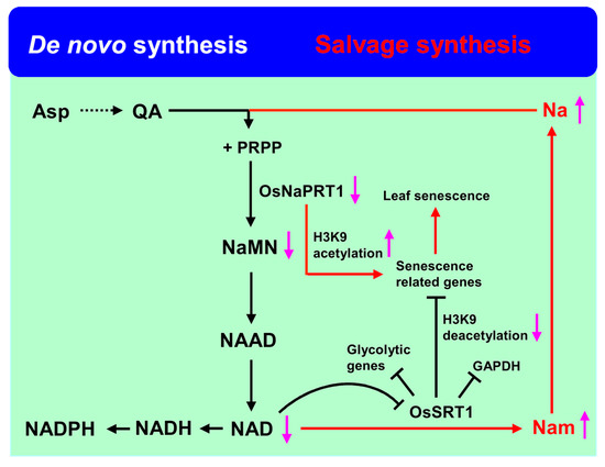 Downstream of NAD, Nam from nicotinate mononucleotide (NaMN) was catalyzed by two enzymes: nicotinamidase and nicotinate phosphoribosyltransferase (NaPRTase) [59,61]. In rice, a mutation of NaPRTase, LTS1, revealed increased concentrations of nicotinate and nicotinamide as well as decreased NAD content. Further research indicated that the decreased NAD repressed the expression of OsSRTs and would result in a lower deacetylation ability of OsSRTs, hence activating senescence-related genes by increasing the acetylation of histone H3K9, leading to leaf senescence in rice (Figure 2) [39].
