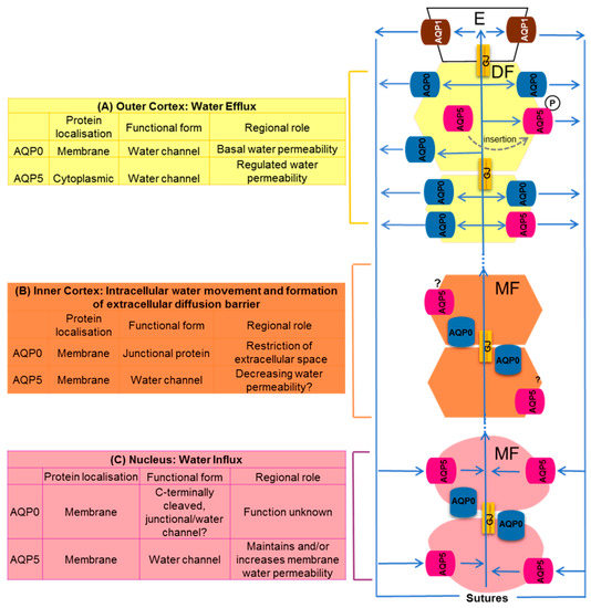 Schematic diagram detailing the relative contributions of AQP0 and AQP5 to fluid circulation in the lens. (A) On the anterior surface of the lens cell AQP1 contributes to the water permeability (PH2O) of the epithelial cells. At the equator in the outer cortex of the lens basal water efflux is proposed to be mediated by water channels formed from the abundant AQP0. However, in this region of the lens water efflux can be up regulated by the shuttling of AQP5 water channels from an inactive cytoplasmic pool of channels to the membrane to form active water channels following phosphorylation by activation of yet to be identified signaling pathways in the lens; (B) in the inner cortex water fluxes are preferentially carried away from the lens core via an intracellular pathway mediated by gap junction channels. In this region AQP0 functionality shifts from being a water channel to a junctional protein that reduces PH2O and narrows the extracellular space to form a barrier to extracellular diffusion. In this region, it is also proposed that the functionality of AQP5 may also be altered to reduce the PH2O of fiber cell non-junctional membranes to facilitate the cell-to-cell movement of water via the gap junctions; (C) in the core of the lens mature fiber cells accumulate fluid delivered to them via the sutures. In this region, the C-terminus of AQP0 is cleaved, while AQP5 remains uncleaved and membranous. In this region, the post-translational changes to AQP0 are expected to alter the regulation of AQP0 and therefore AQP5 may compensate for any loss in the contribution of AQP0 to the PH2O of mature fiber cells.