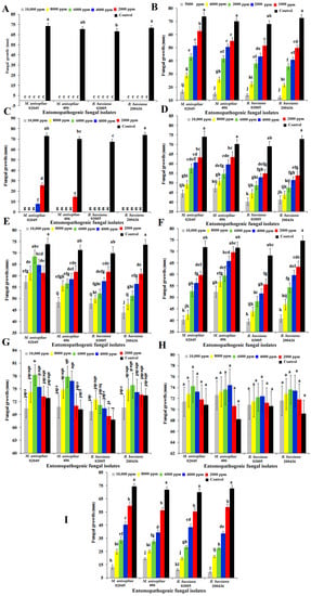 The effect of different concentrations of n-hexanoic acid (A), naphthalene (B), nonanal (C), n-pentadecane (D), n-tetradecane (E), n-heptadecane (F), n-hexadecane (G), oleic acid (H) and methyl octanoate (I) on the radial growth (12-d colony diameter) of entomopathogenic fungal isolates at 26 ± 1 °C, in complete darkness. Mean ± SE values followed by different letter(s) are significantly different (Fisher’s LSD test, α = 0.05). Values are the means of five replicates, and each replicate is the average of five Petri dishes.