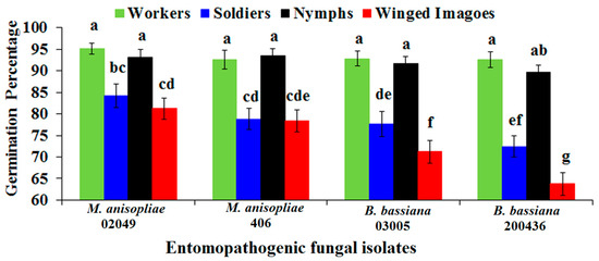Percent germination of the conidia of entomopathogenic fungal isolates on the cuticle of workers, soldiers, nymphs and winged imagoes. Values are the means of five replicates. Mean ± SE values followed by different letter(s) are significantly different (Fisher’s LSD test, α = 0.05).