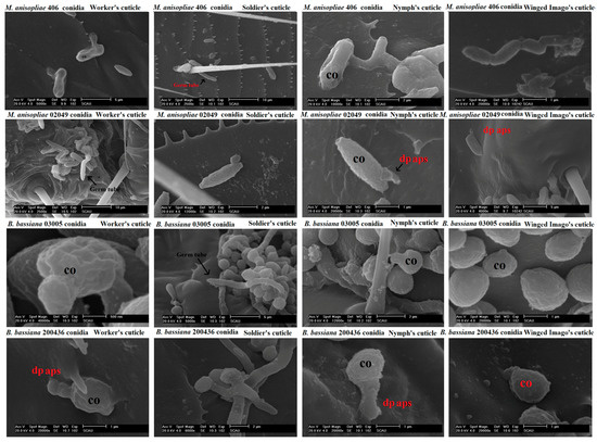 SEM used for the detection of growth patterns of tested isolates of entomopathogenic fungi on the cuticle of workers, soldiers, nymphs and winged imagoes of C. formosanus Shiraki. dp aps stands for directly-penetrating appressorium-like structure; co stands for unipolar-germinated conidium.