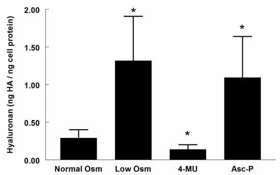 Hyaluronan (HA) content in supernatants of cultured renomedullary interstitial cells (RMICs) during control conditions (normal osmolality) and after 24 h exposure to hypo-osmotic media conditions (200 mOsm/kg H2O), a hyaluronidase inhibitor (Asc-P) or the HA synthesis inhibitor 4-MU.* p < 0.05 vs. corresponding value of control cells (normal osmolality).