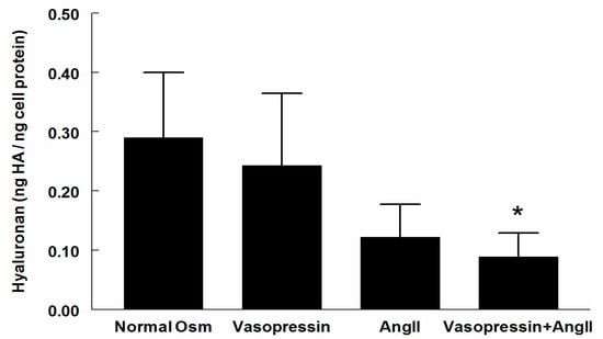Neither Ang II nor vasopressin alone reduced HA in the supernatant significantly (−16% and −58%, respectively, ns). However, when the combination of Ang II and vasopressin was used, HA was reduced by 69% (p < 0.05) (Figure 2).