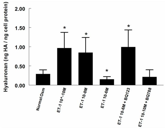 Endothelin-1 (ET-1) at 10−10 M and 10−8 M increased supernatant HA more than 3-fold (p < 0.05), while, on the contrary, a high concentration of ET-1 (10−6 M) reduced HA by 47% (p < 0.05, Figure 3) as compared with untreated control cells. The ET-A receptor antagonist BQ123 not only reversed the reducing effect of the high concentration of ET-1 on HA, but elevated it to the same level as low concentration ET-1 (10−10 M), suggesting an important mechanism involving the still active ET-B receptor. This was corroborated by the addition of ET-B receptor antagonist BQ788 to low concentration ET-1, which abolished the increase in HA.