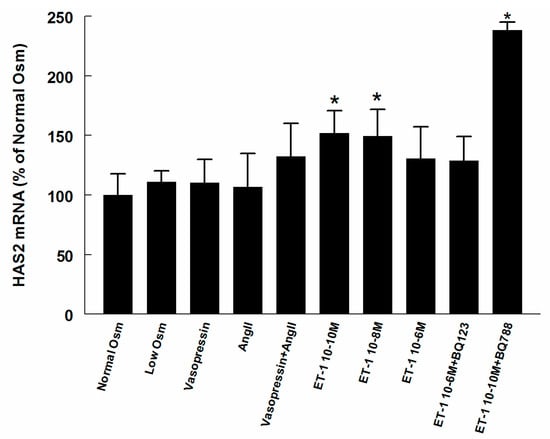 mRNA expressions of hyaluronan synthase 2 (HAS2) in RMICs during different treatments. All values are in relation to cells grown at normal osmolality = 100%. * p < 0.05 vs. control cells (normal osmolality).