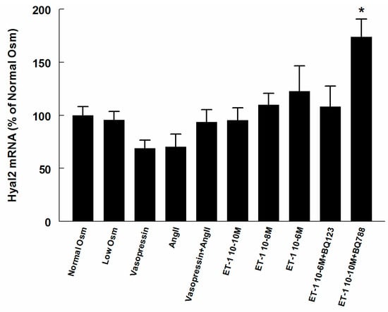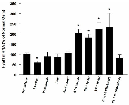 In RMICs grown in hypo-osmolar conditions the Hyal1 mRNA was reduced by 35% as compared to iso-osmolar conditions (p < 0.05, Figure 7), while Ang II and vasopressin, alone or in combination, did not change the expression. All concentrations of ET-1 elevated the Hyal1 mRNA expression similarly. This elevation was not affected by the ET-A receptor blocker BQ123, but was abolished by the ET-B receptor blocker BQ788.