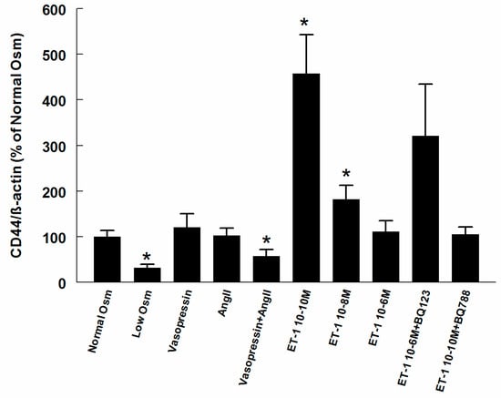 RMICs were plated at a density of about 5 × 104 cells/cm2 for 48 h in a 1:1 mixture of two media: Roswell Park Memorial Institute (RPMI) 1640 culture medium and Dulbecco’s Modified Eagle’s Medium (DMEM) culture medium conditioned by 3T3 mouse fibroblasts, the mixture containing a total of 15% fetal bovine serum, as previously described []. The cells were then treated for 24 h with different compounds described below. Following 24 h treatment, the supernatant was collected and analyzed for HA content and Hyal activity. Cells were harvested and analyzed for CD44 expression and gene expression of HAS and Hyals. The amount of protein was determined using a routine method (DC Protein Assay, Bio-Rad Laboratories, Hercules, CA, USA). Ang II (Bachem, Bubendorf, Switzerland), vasopressin (Sigma-Aldrich, St. Louis, MO, USA), or a combination of the two were given in concentrations of 10−6 M. ET-1 (Sigma-Aldrich) was administrated to provide final concentrations of 10−10 M, 10−8 M, or 10−6 M. The highest ET-1 concentration (10−6 M) was also given together with the selective ET-A receptor antagonist BQ123 (10−6 M) (Sigma-Aldrich). The lowest ET-1 concentration (10−10 M) was also given together with the selective ET-B receptor antagonist BQ788 (10−6 M) (Sigma-Aldrich). The Hyal inhibitor l-ascorbic acid 6-hexadecanoate (Asc-P) was purchased from Sigma-Aldrich and administered in a final concentration of 10−7 M. The HA synthesis inhibitor 4-methylumbelliferone (4-MU; Sigma-Aldrich) was used in a concentration of 10−6 M. Growth media osmolality was reduced to 200 mOsm/kg H2O by 2:3 dilution with distilled water.