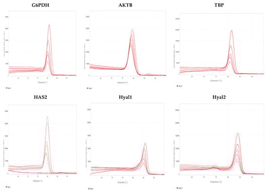Total RNA was isolated from the cells (RNAquous®-4PCR, Ambion, Austin, TX, USA). cDNA was obtained from the RNA (iScript™cDNA Synthesis Kit, Bio Rad Laboratories, Hercules, CA, USA), and the following semi-quantitative real-time PCR was performed by LightCycler® FastStart DNA MasterPLUS SYBR Green I (Roche Diagnostics, Mannheim, Germany) in a Lightcycler system (Roche Diagnostics, Mannheim, Germany). PCR products were verified by agarose gel electrophoresis. The mRNA analyzed were Hyal1 and 2, and HAS2. All values were normalized for reference genes TATA-binding protein (TBP), β-actin (Actb), and glucose-6-phosphate dehydrogenase (G6PDH). Values were then expressed as normalized values for the means of the reference genes by using the formula: 2^Ct(reference genes) – Ct(gene of interest), where Ct is the cycle number and Ct for the reference genes is a mean of the cycle numbers for the reference genes, which did not differ much from each other. Primers were obtained from MWG Biotech (Ebersberg, Germany), with sequences presented in Table 1. Primers were evaluated in terms of efficiency (Table 2), melt curves (Figure 9), and verified product size.