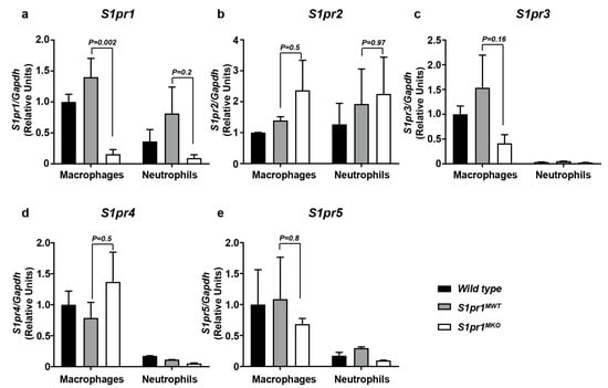 S1pr1, 2, 3, 4 and 5 gene expression in macrophages and neutrophils from S1pr1MKO mice. Thioglycollate-elicited peritoneal macrophages or neutrophils were harvested from wild-type (WT) C57BL6/J (black bars), S1pr1MWT (grey bars) and S1pr1MKO mice (white bars) and RNA extraction and quantitative real time, reverse transcriptase PCR was performed as described in the Methods section, for (a) S1pr1; (b) S1pr2; (c) S1pr3; (d) S1pr4; and (e) S1pr5. Gapdh was used as an internal control. Group sizes are (a): n = 5 for macrophages and n = 3 for neutrophils; (b): n = 4 for macrophages and n = 3 for neutrophils; (c): n = 6 for macrophages and n = 3 for neutrophils; (d,e): n = 3 for both macrophages and neutrophils, where each replicate represents cells isolated from a different mouse. Results are expressed as means ± SEM and are relative to levels detected in macrophages from WT mice (black bars). Data were analyzed by one-way ANOVA with Tukey’s multiple comparisons test. p-values are indicated on the graphs for comparisons between S1pr1MKO and S1pr1MWT cells. Gene expression levels in wild type and S1pr1MWT cells were not statistically significantly different (p > 0.3).