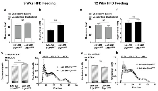 Plasma lipid and lipoprotein analysis in LdlrBM S1pr1 MKO and LdlrBM S1pr1 MWT mice fed a high fat diet (HFD) for nine or twelve weeks. LdlrBM S1pr1 MKO and control LdlrBM S1pr1 MWT generated by transplanting bone marrow (BM) from either S1pr1MKO or control S1pr1MWT mice into lethally irradiated Ldlr KO recipients as described in the Methods section. After four weeks of recovery from BM transplantation, chimeric mice were fed a HFD for (a–d) 9 weeks or (e–h) 12 weeks; (a,e) plasma levels of cholesterol ester (grey bar) and unesterified cholesterol (white bar); (b,f) triglycerides and (c,g) High density lipoprotein (HDL)-associated cholesterol (HDL-C) (black and grey striped bar) and non-HDL-C (white and grey striped bar). Group sizes are n = 13 LdlrBM−S1PR1−MWT and n = 14 LdlrBM S1pr1 MKO mice fed for 9 weeks and n = 19 LdlrBM−S1PR1−MWT and n = 10 LdlrBM S1pr1 MKO mice fed for 12 weeks; (d,h) average plasma lipoprotein total-cholesterol profiles for n = 3 LdlrBM−S1PR1−MWT (white symbol) and n = 10 LdlrBM S1pr1 MKO mice (black symbol) fed for either 9 or 12 weeks as indicated. Bars above the profiles indicate fractions in which purified human lipoproteins elute. Results are shown as means ± SEM. Data in panels b and f were analyzed by the Mann–Whitney rank sum test, while data in all other panels were analyzed by two-way ANOVA with Tukey’s multiple comparisons test. No statistically significant differences (NS) between LdlrBM S1pr1 MKO and LdlrBM S1PR1 MWT mice were found.