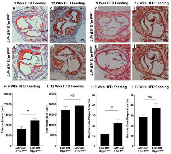 Atherosclerotic plaques from nine-week HF diet-fed LdlrBM S1pr1 MKO mice exhibited larger sized necrotic cores (average 22.6 ± 3.6% of total plaque size) than similarly fed LdlrBM S1pr1 MWT mice (average 11.5 ± 4.2% of total plaque size) (Figure 3g,h,k). As for average atherosclerotic plaque sizes, the relative necrotic core sizes increased 1.6–2.5-fold for both LdlrBM S1pr1 MKO and control LdlrBM S1pr1 MWT mice after 12 weeks of HF diet feeding (Figure 4i,j,l). Although there was a trend towards increased average necrotic core sizes in the LdlrBM S1pr1 MKO compared to LdlrBM S1pr1 MWT mice (37.3 ± 4.6 versus 28.4 ± 2.2% of total plaque size, respectively), the differences were not statistically significant after 12 weeks of HF-diet feeding.