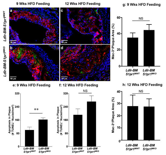 S1pr1 deficiency in BM-derived myeloid cells accelerates accumulation of apoptotic cells in atherosclerotic plaques of HF-diet fed Ldlr KO mice. (a–d) representative images of atherosclerotic plaque sections stained for TUNEL + nuclei (green fluorescence), Mac-3 (macrophage marker, red fluorescence) and DAPI (nuclei, blue fluorescence). Scale bars represent 50 µm; (e,f) the numbers of TUNEL+ apoptotic cells within atherosclerotic plaques in each section were counted and normalized to the total atherosclerotic plaque cross-sectional areas in each section for mice fed the HF diet for nine (panel (e)) and twelve weeks (panel (f)). Data are means ± SEM of n = 10 S1pr1MWT and nine S1pr1MKO BM transplanted mice fed for nine weeks (panel (e)), and n = 9 S1pr1MWT and 10 S1pr1MKO BM transplanted mice fed for 12 weeks (panel (f)); (g,h) the cross-sectional area of Mac-3+ staining within plaques was normalized to the total atherosclerotic plaque area in the corresponding section and mean ± SEM values of n = 5 mice fed for nine weeks (panel (g)) and 12 weeks (panel (h)). Data were analyzed by the Mann–Whitney rank sum test; ** p = 0.01; NS (non-significant) indicates p > 0.05.