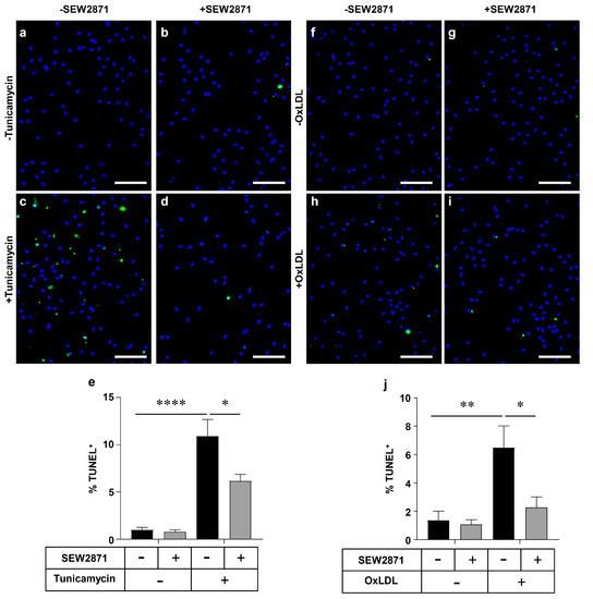 To explore the mechanisms by which inactivation of S1PR1 expression in BM-derived myeloid cells, including macrophages, accelerated the accumulation of apoptotic nuclei in atherosclerotic plaques of BM transplanted and HF diet-fed Ldlr KO mice, we examined the effects of treatment of primary mouse macrophages with SEW2871, a selective S1PR1 agonist [33], on apoptosis induced by either tunicamycin, an inhibitor of protein glycosylation that induces apoptosis secondary to ER-stress, and oxLDL, an inducer of oxidative stress [9,10,17,18]. No evidence of apoptosis above baseline levels was detected in macrophages treated with SEW2871 alone (Figure 5a,b,f,g). When macrophages were exposed to 10 µg/mL tunicamycin, a significant increase in apoptosis was detected (Figure 5a,c,e). Cells co-incubated with tunicamycin in presence of 1 µm SEW2871 exhibited significantly (~40%) reduced levels of apoptosis compared to macrophages treated with tunicamycin alone (Figure 5c–e). Similar results were observed when apoptosis was triggered by exposure of macrophages to oxLDL (100 µg protein/mL). OxLDL-treated macrophages exhibited significantly increased apoptosis compared to untreated macrophages (Figure 5f,h,j), while treatment with SEW2871 reduced the level of oxLDL-induced apoptosis by approximately 65% (Figure 5h–j). Together, these results suggest that the S1PR1 selective agonist, SEW2871, protects macrophages against apoptosis induced by either the ER stress-inducing agent tunicamycin or by oxLDL.
