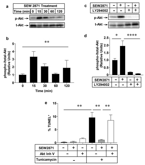 We have previously reported that PI3K and Akt1 signaling is involved in SEW2871 induced macrophage migration [34]. To test the involvement of Akt in SEW2871 mediated protection of macrophages against apoptosis, peritoneal macrophages from wild type, C57BL6/J mice were incubated with 1 µm SEW2871 for different periods of time, from 15 min to 2 h. Untreated macrophages were included as a 0 time control. Immunoblotting for Akt phosphorylated at Ser 473 (p-Akt) and total Akt levels (Figure 6a,b) revealed that SEW2871-treatment of peritoneal macrophages from wild type mice resulted in induction of Akt phosphorylation with levels peaking at 15 min and declining thereafter. The transient increase in p-Akt after 15 min of incubation with SEW2871 was blocked by pre-treatment of cells with the PI3K inhibitor LY294002 (Figure 6c,d). To test if Akt is directly involved in SEW2871-mediated protection against apoptosis, macrophages were incubated with a pan-Akt inhibitor (Akt Inh. V) before exposure to tunicamycin and SEW2871. Akt Inh. V-treatment, alone, appeared to slightly increase the baseline level of apoptosis although this did not reach statistical significance (Figure 6e). As above, tunicamycin treatment induced macrophage apoptosis and treatment with SEW2871 protected them (in this experiment, fully) against tunicamycin-induced apoptosis (Figure 6e). On the other hand, macrophages that were pre-treated with Akt Inh. V were not protected by SEW2817 against tunicamycin-induced apoptosis (Figure 6e). Together these results demonstrate that the S1PR1 selective agonist SEW2871 protects macrophages from apoptosis through activation of the PI3K/Akt signaling pathway.
