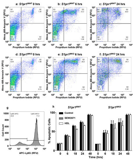 Apoptosis of neutrophils from S1pr1MKO or S1pr1MWT mice is unaffected by HDL or SEW2871 treatment. Neutrophils prepared from S1pr1MKO or S1pr1MWT mice were either not treated or treated with 1 µm SEW2871 or 50 μg (protein)/mL HDL and cultured for up to 48 h. At different times, cells were washed, stained with APC-labeled Ly6G (neutrophil marker), Alexa 488-labeled annexin V and propidium iodide and analyzed by flow cytometry. (a–f) representative scatter plots of Alexa 488-annexin V and propidium iodide staining of untreated neutrophils from (a–c) S1pr1MWT mice or (d–f) S1pr1MKO mice after (a,d) 0, (b,e) 6 and (c,f) 24 h in culture; (g) representative histogram of APC-Ly6G staining, showing the Ly6G-positive population of cells analyzed for annexin V and propidium iodide staining; (h) quantification of apoptosis (% cells that were positive for Alexa 488-annexin V staining) in cultures of neutrophils from S1pr1MWT or S1pr1MKO mice over 48 h in culture without or with SEW2871 or HDL treatment. Data in h are means ± SD of n = 3 replicates where each replicate represents cells prepared from a different mouse. Data were analyzed by two-way repeated measures ANOVA. Apoptosis significantly increased over time (p < 0.0001) but values for S1pr1MWT or S1pr1MKO neutrophils or treatment with HDL or SEW2871 were not statistically significantly different (p > 0.3).