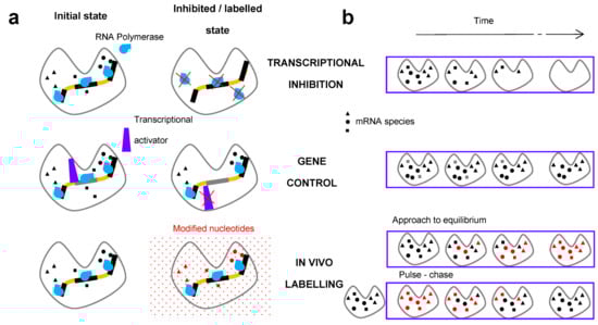 Main classes of methods to study RNA stability. (a) Scheme of the molecular mechanism affected by the specific method procedures. In transcriptional inhibition, the RNA polymerase is inactivated; the expression of all genes is reduced. In the gene control method, a transcriptional activator dissociates from a specific promoter, shutting off the expression of the specific gene under the control of this promoter. For labelling of the RNAs, modified nucleotides are introduced into the cell (red dots), which are then incorporated into the RNA; (b) Time course of the experiments to determine RNA half-lives. Inhibition of transcription of the gene(s) is triggered at t = 0 in transcriptional inhibition and gene control methods. There are two subclasses of the in vivo labelling. In the approach to equilibrium method, a pulse of modified nucleotides is applied and the increase of the labelled mRNA is monitored. In the pulse–chase method, the RNA is first labeled (pulse period). During the chase period starting at t = 0, the labeled nucleotides are washed out and replaced with unlabeled nucleotides and the decline of the labelled RNA is monitored.