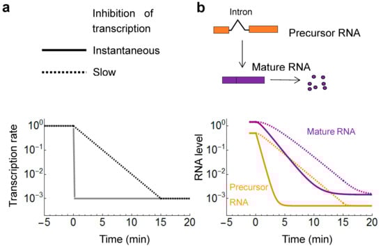 Despite the importance of this control experiment, relatively few studies have reported the half-time of the precursor RNA [,]. The reported values range between 0.5 and 1 min, which constitute the lower limit of the half-lives that can be reliably detected. If the experimental set-up is not optimal and the precursor declines slowly, the experimental conditions can be modified to accelerate the transcriptional inhibition. For example, thermal inactivation of the polymerase at 39 °C instead of 37 °C accelerates the inhibition [].