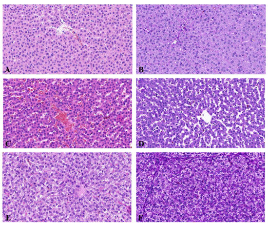 The histological appearance of porcine liver subjected to 0.05 mg/kg bw/day of BPA was characterized as having central vein and hepatic sinusoid dilatation, as well as vascular congestion. Moreover, those samples subjected to 0.5 mg/kg bw/day BPA showed remarkable vacuolar degeneration. All other components of the liver, such as the lobules, appeared normal. The histopathology of the porcine liver control samples displayed unremarkable liver lobular structure with normal hepatocytes and sinusoids. Liver sections of the high dose BPA experimental group showed hepatocytes with marked vacuolar degeneration, and staining showed changes consistent with glycogen depletion. Representative images of the histopathological samples are shown in Figure 1.