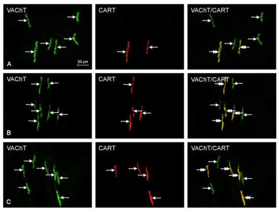 Representative images of immunocytochemical localization of VAChT-, and CART-immunoreactive nerve fibers in intrahepatic sympathetic nerves (arrows) of the control (CTRL; (A)), E1—experimental group 1 (low dose of bisphenol A; (B)), and E2 – experimental group 2 (high dose of bisphenol A, (C)); VAChT or CART-IR nerve fibers are indicated with arrows, VAChT and CART-IR nerve fibers are indicated with double-headed arrows; scale bars in all figures; 20 μm.