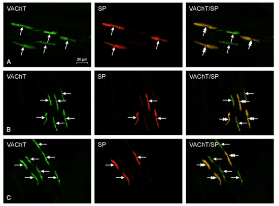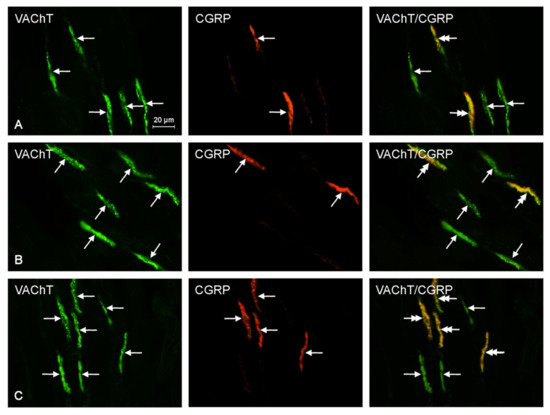To evaluate the number of VAChT+ intrahepatic nerves, the nerves were counted using a microscopic observation field (0.1 mm2). Nerves immunoreactive to VAChT were counted in four sections of the liver per animal (in five randomly selected observation fields per section) and the obtained data were pooled and presented as a mean ± SEM. The method used to evaluate the neurochemical characteristics of VACHT+ nerves consisted of determining what percentage of all such nerve fibers were simultaneously immunoreactive to each of the other substances included in the investigation. To this end, at least 300 VAChT-labeled nerves in each studied animal were examined for immunoreactivity to the other particular substance studied. VAChT-positive nerve fibers were considered as representing 100%. The evaluation of immunopositive nerve fibers and the counting of nerves were performed by two independent investigators. Double-labeled nerve fibers were visualized under an Olympus BX51 microscope equipped with epi-fluorescence and appropriate filter sets. The obtained results were pooled and presented as a mean ± SEM. To prevent double counting of the same nerves, the sections of liver evaluated during the present study were located at least 100 µm apart. Statistical analysis was carried out via Student’s t test (Graphpad Prism v. 6.0; GraphPad Software Inc., San Diego, CA, USA). The differences were considered statistically significant at p ≤ 0.05.