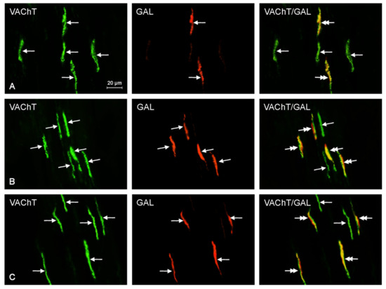 Representative images of immunocytochemical localization of VAChT- and GAL-immunoreactive nerve fibers in intrahepatic sympathetic nerves (arrows) of the control (CTRL; (A)), E1—experimental group 1 (low dose of bisphenol A; (B)), and E2—experimental group 2 (high dose of bisphenol A, (C)); VAChT or GAL-IR nerve fibers are indicated with arrows, VAChT and GAL-IR nerve fibers are indicated with double-headed arrows; scale bars in all figures; 20 μm.