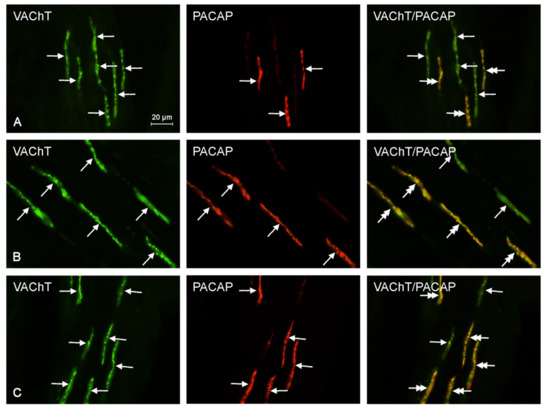Representative images of immunocytochemical localization of VAChT- and PACAP-immunoreactive nerve fibers in intrahepatic sympathetic nerves (arrows) of the control (CTRL; (A)), E1—experimental group 1 (low dose of bisphenol A; (B)), and E2—experimental group 2 (high dose of bisphenol A, (C)); VAChT or PACAP-IR nerve fibers are indicated with arrows, VAChT and PACAP-IR nerve fibers are indicated with double-headed arrows; scale bars in all figures; 20 μm.
