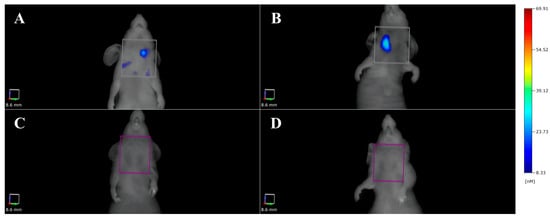 Fluorescent molecular tomography (FMT) of orthotopic ATC bearing mice injected with a 750 nm dye labeled with anti-CD44 antibody (A,B) or with the unlabeled dye (C,D). In (A): 2 h after injection of the anti-CD44 labeled dye, diffuse signal is present in the neck region, with some uptake in the normal thyroid lobe. In (B): after 6 h, the probe is specifically concentrated into the neoplastic lobe. In (C) and (D): the control mouse injected with the unlabeled probe and 2 and 6 h after the injection, respectively; no signal was identified in the neck region.