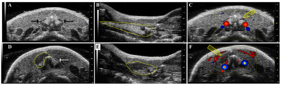 HFUS of the neck region of normal (A–C) and of orthotopic ATC bearing mouse (D–F). In (A): trans-axial brightness (B-)mode scan of the neck region at the level of the first tracheal rings; black arrows point to the normal thyroid lobes. In (B): longitudinal B-mode scan paramedian to the trachea; the yellow dotted line identifies a normal thyroid lobe. In (C): trans-axial color-Doppler scan of (A); the yellow arrow indicates the low blood flow of the normal thyroid. In red, blood flow towards the ultrasound beam, in blue, blood flow shifting away from it. In (D): trans-axial B-mode scan of the neck region at the level of the first tracheal rings; white arrow points to the normal thyroid lobe and the yellow dotted line identifies the orthotopic ATC two weeks after injection. In (E): longitudinal B-mode scan paramedian to the trachea; the yellow dotted line identifies the orthotopic ATC two weeks after injection. In (F): trans-axial color-Doppler scan of (D); the yellow arrow indicates the high blood flow of the orthotopic ATC two weeks after injection. In red, blood flow towards the ultrasound beam, in blue, blood flow shifting away from it.