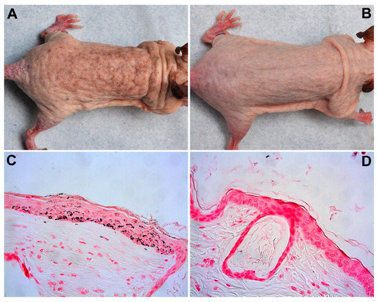 (A) Picture of a pigmented mouse; (B) Picture of a non-irradiated control mouse; (C) Melanin staining (Fontana-Masson ×40) of UV irradiated mouse skin [17]; (D) Melanin staining (Fontana-Masson ×40) of non-irradiated mouse skin with no visible melanin [17]. Figure 1C,D have been previously published [17], and are reproduced with permission from Catharina M. Lerche, Experimental Dermatology; published by Wiley and Sons, 2009.