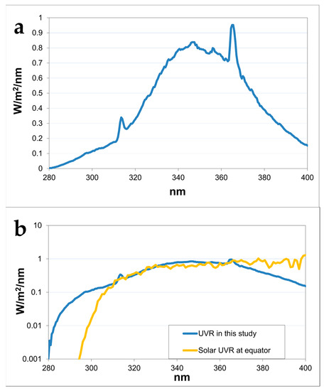 UVR spectra (a) Spectrum of the UVR used in this study, consisting of one Philips TL12 tube placed between five Bellarium-S SA-1-12 tubes; (b) Spectra from UVR used in this study (blue) and solar UVR at equator (orange) measured in the Spring, clear sky, solar height of 88° with an ozone layer of 250 DU and a UV-index of 11.6 (0.9 × 11.6 = 10.4 SED/h.