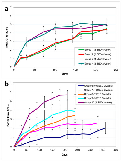 Dose–response studies have mostly been conducted in hairless albino mice, and have shown a linear relationship between (a) time to tumor appearance and log dose [9,10], or (b) log time to tumor appearance and log dose [28]. Similarly, our dose–response study also shows a linear relation between log time to tumor and log weekly dose, R2 = 0.802 (Figure 4b). In Figure 4c, we have adjusted the dose for the individual pigmentation of each mouse in the study, resulting in an effective dose reaching each mouse. The R2-value increases to 0.826 in Figure 4c, compared with 0.802 in Figure 4b. We chose doses from 1.8 to 12 SED per week with a maximum of 4 SED per irradiation. One dose of 4 SED corresponds to the minimal erythema dose (MED) in mice and most Danes. The ambient UVR around noon on a Danish summer day (latitude 56° N) is 6 SED/h [33]. We did not use doses higher than 12 SED per week, since this would have increased the risk of skin damage and wounds in our mice. On the other hand, decreasing the dose below 1.8 SED per week would have resulted in a very long time until tumor development, and the risk of mice dying before this occurred increased.