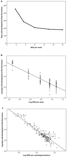 Dose–response curves (Groups 6–10) (a) Standard erythema doses (SED) per week as a function of median days until development of the first tumor; (b) Log10 SED per week as a function of log10 median days until development of the first tumor (y = −0.48X + 2.72, R2 = 0.802); (c) Log10 (SED per week/pigmentation) as a function of log median days until development of the first tumor (y = −0.48X + 1.44, R2 = 0.826).