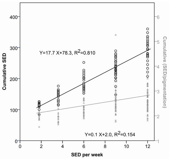 Pigmentation reduces the UVR penetrating into the epidermis, and it will modify UVR dose for pigmented individuals. Thus, the linear dose–response curve in Figure 4b underwent adjustment for individual mouse pigmentation, and is depicted in Figure 4c. To investigate how important pigmentation and weekly UVR dose are for the cumulative dose at tumor development, we performed multiple linear regression analyses. These showed that the weekly UVR dose (R2 = 0.810) and pigmentation (R2 = 0.294) is of importance for the cumulative dose at the start of tumor development. Since pigmentation is a significant factor for the cumulative dose at tumor development, we also established the linear relation between the cumulative dose at tumor appearance and the weekly UVR dose, this time adjusting for the pigmentation (Figure 5, grey line, linear fit, Y = 0.1X + 2.0, R2 = 0.154). Findings demonstrated that the lower the weekly UV dose, the smaller the cumulative UV dose necessary for tumor development, though the relationship was less pronounced than before. When the weekly UVR dose was reduced from 12 to 6 SED, the cumulative UVR dose to tumor development decreased approximately 15%.
